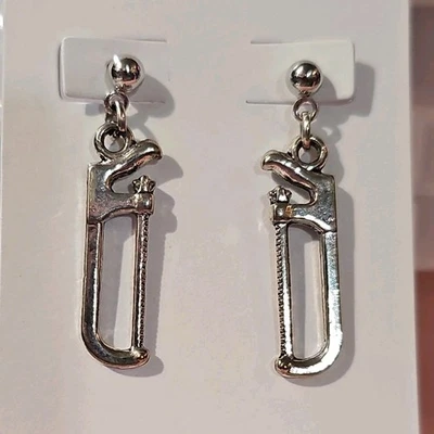 Silver Metal Saw Shape Dangle Earrings Gadgets & Tools Theme
