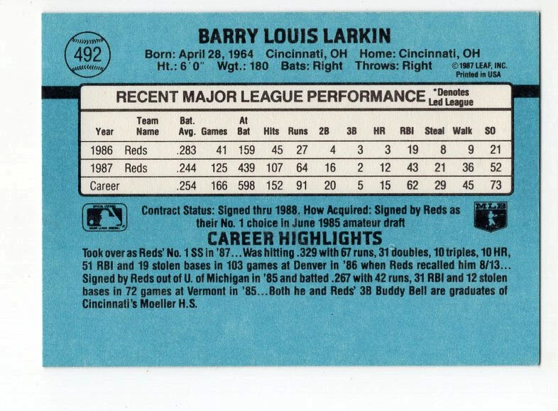1988 Donruss Barry Larkin (HOF) #492 Cincinnati Reds Free Shipping