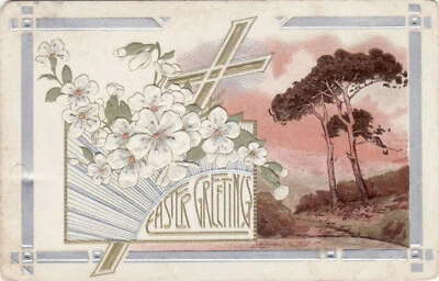 Easter Greetings Cross Trees Flowers - Old Postcard Posted 1908 Embossed