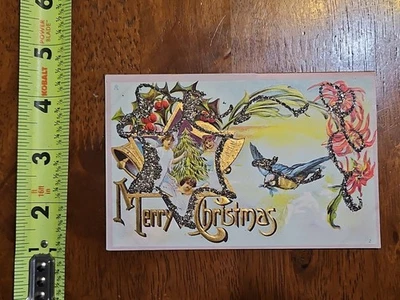 RARE OLD VINTAGE POSTCARD BEDAZZLED MERRY CHRISTMAS ANGELES BLUE BIRD