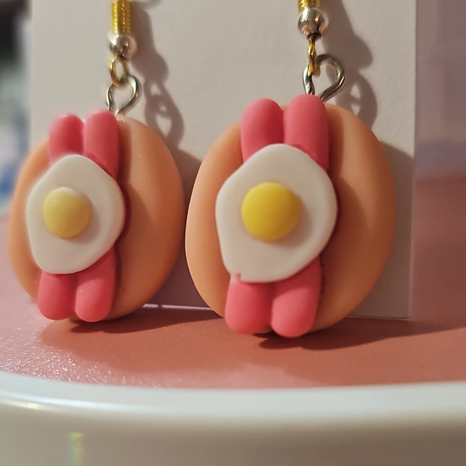 Polymer Clay Fried Egg Bacon Dangle Earrings Round Food Theme Handmade