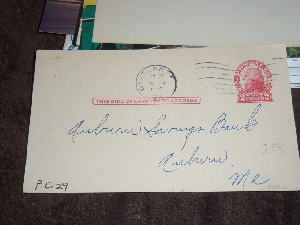 POSTAL CARD LOWRY NATIONAL BANK ATLANTA,GA. TO AUBURN SAVINGS BANK ME.JUN.241919