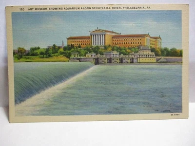 WWII POSTCARD ART MUSEUM AQUARIUM SCHUYLKILL RIVER, PHILADELPHIA STATS BIO RARE