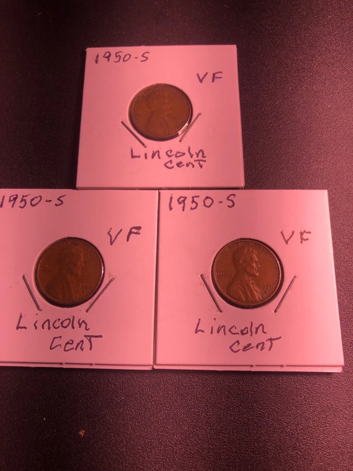 (3) Lincoln wheat cent pennys, 1950-S all VF
