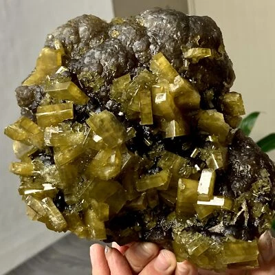 3.5LB Shiny Golden Cuboid Barite Crystal Based on the Purple Spherical Fluorite