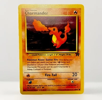 Pokémon Charmander card, Team Rocket set, Wizards of the Coast, orange artwork.
