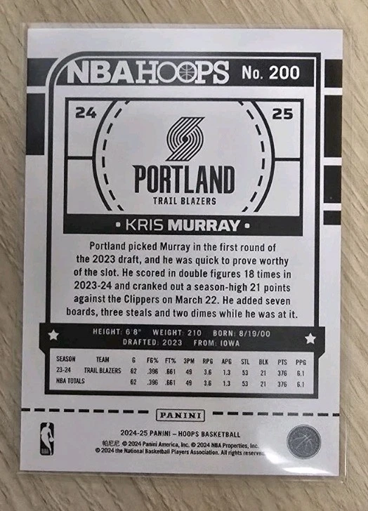 2024-25 Panini NBA Hoops #200 Kris Murray Blue Portland Trail Blazers