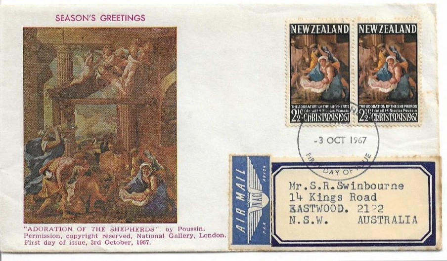 1967 Christmas FDI Auckland 3 Oct 1967 on Airmail Cover to Australia