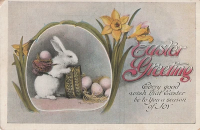 Easter fantasy used 1924 postcard bunny w/basket and eggs