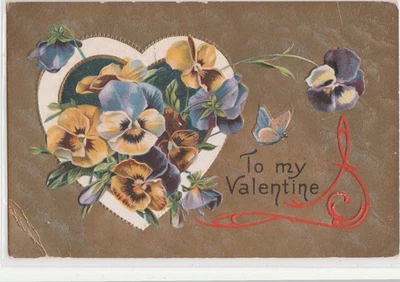 Valentines Day fantasy used 1910 postcard heart and pansies