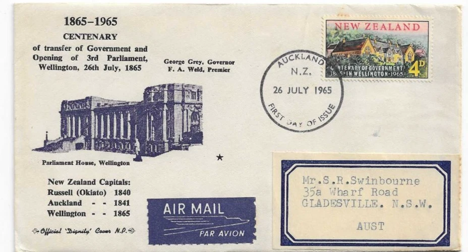1965 Parliament Centenary FDI Auckland 26 Jul 1965 on Airmail Cover to Australia