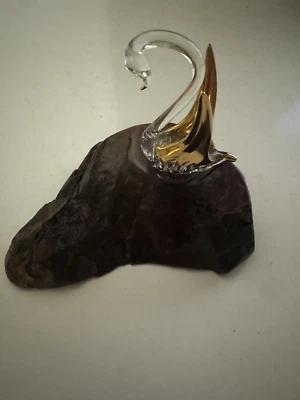 Beautiful Clear Glass with Gold Wings Hand Blown Swan on Wood Base