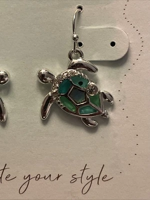 NEW Silver Turtle Earrings Rhinestones & Blue, Green Stones 1 1/8” long Beach