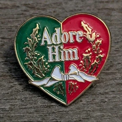 "Adore Him" Christmas Hymn Lyric Red & Green Heart & Bow Religious Lapel Pin
