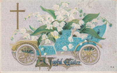 Easter fantasy used 1923 postcard flower covered car