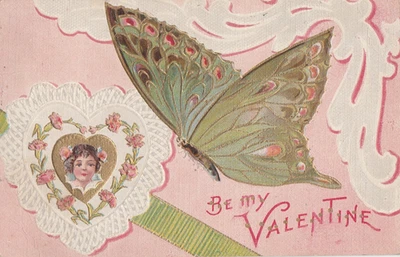 Valentines Day fantasy used 1910 postcard girl and butterfly