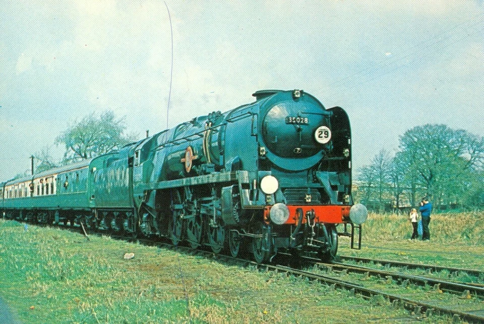 SR STEAM LOCO ON POSTCARD TRAIN PICTURE REBUILT MERCHANT NAVY 35028 ON PHOTO.