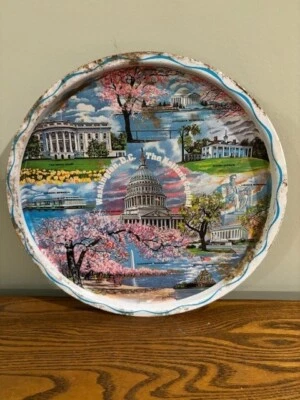 Vintage Washington DC Cherry Blossoms Souvenir Metal Tin Serving Tray Monuments