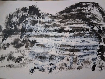 Original Art Acrylic Paper Abstract 6"x9" Landscape Black & White Hillside