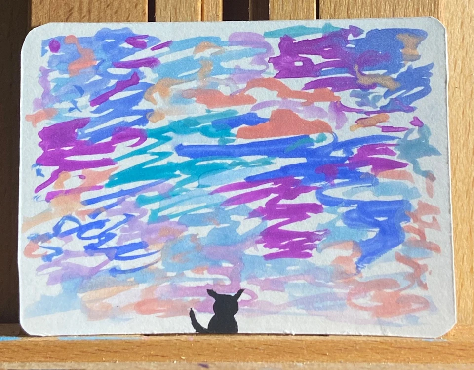 Alone Cat sparkly swirl ACEO gouache painting on Bristol board paper original