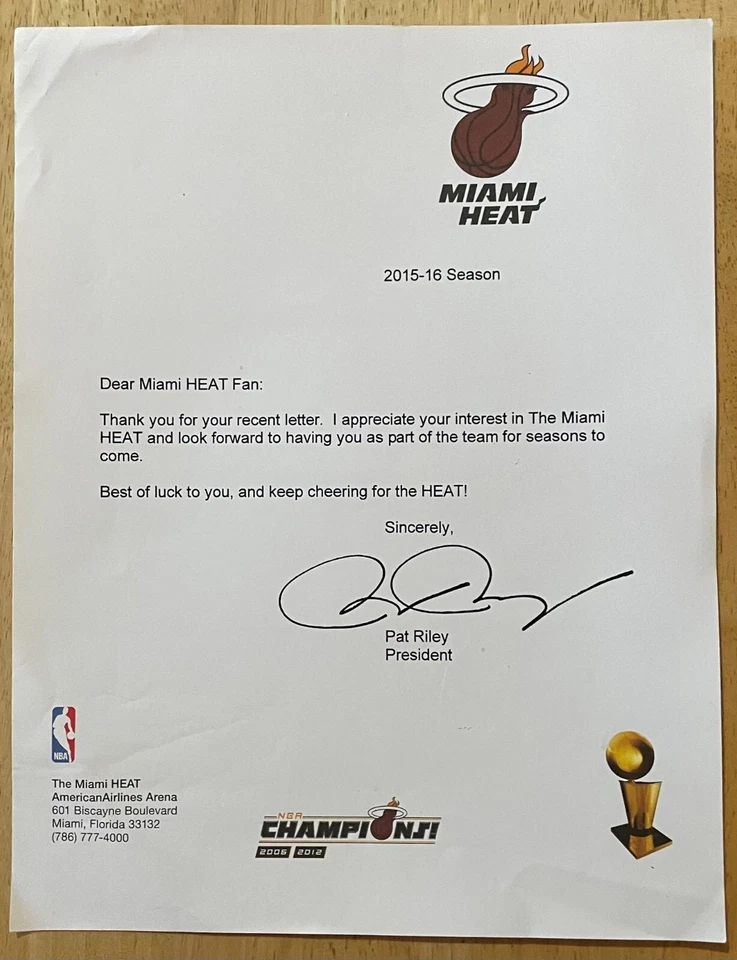 PAT RILEY, 8 1/2" x 11" MIAMI HEAT LETTER, FANTASTIC, 2015-2016 SEASON !