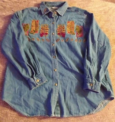 Vintage Denim Long Sleeve Button Down Shirt Women's Size Large Leaf Embroidered