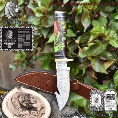 Ashen Edge Forged Skinner Knife w/Gut Hook Twist Damascus Micarta Camping