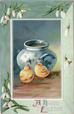A Happy Easter Clay Pot & Two Chicks - Old Postcard Posted 1911 Embossed Divided