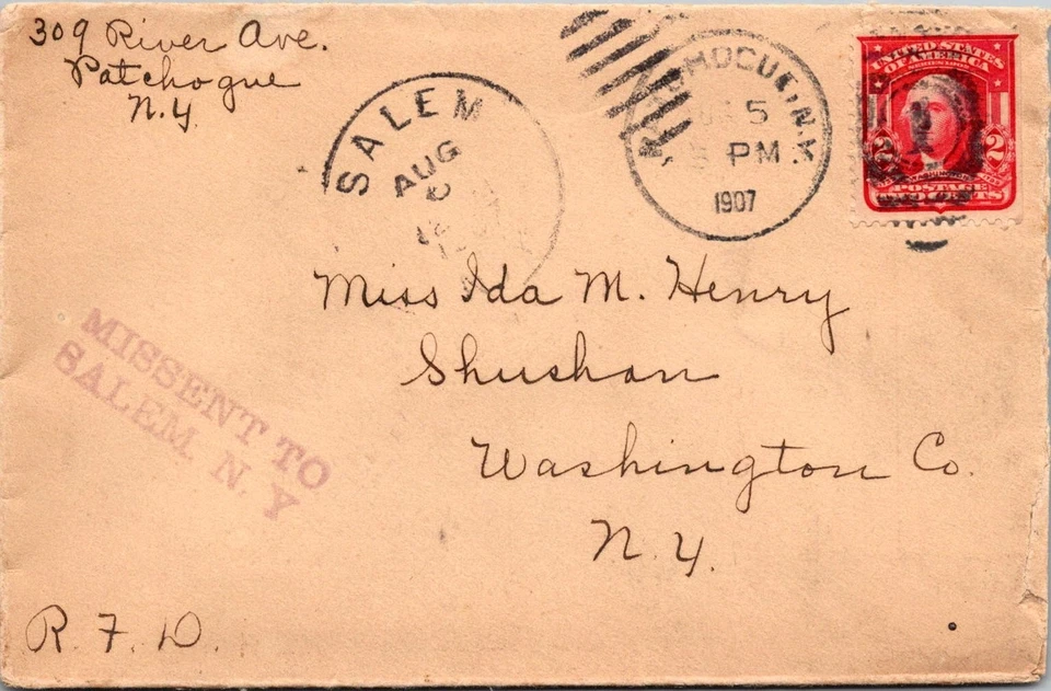 GOLDPATH: US cover 1907 Patchogue, NY missent CV906_P19