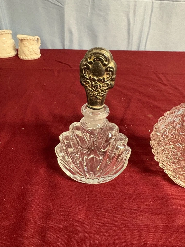 Vintage Art Deco Perfume Bottle – Cut Glass Fan Shape with Ornate Metal Stopper
