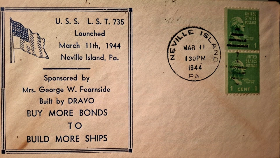 US Navy postal cancelation stamp U.S.S L.S.T 735 Neville Island 1944