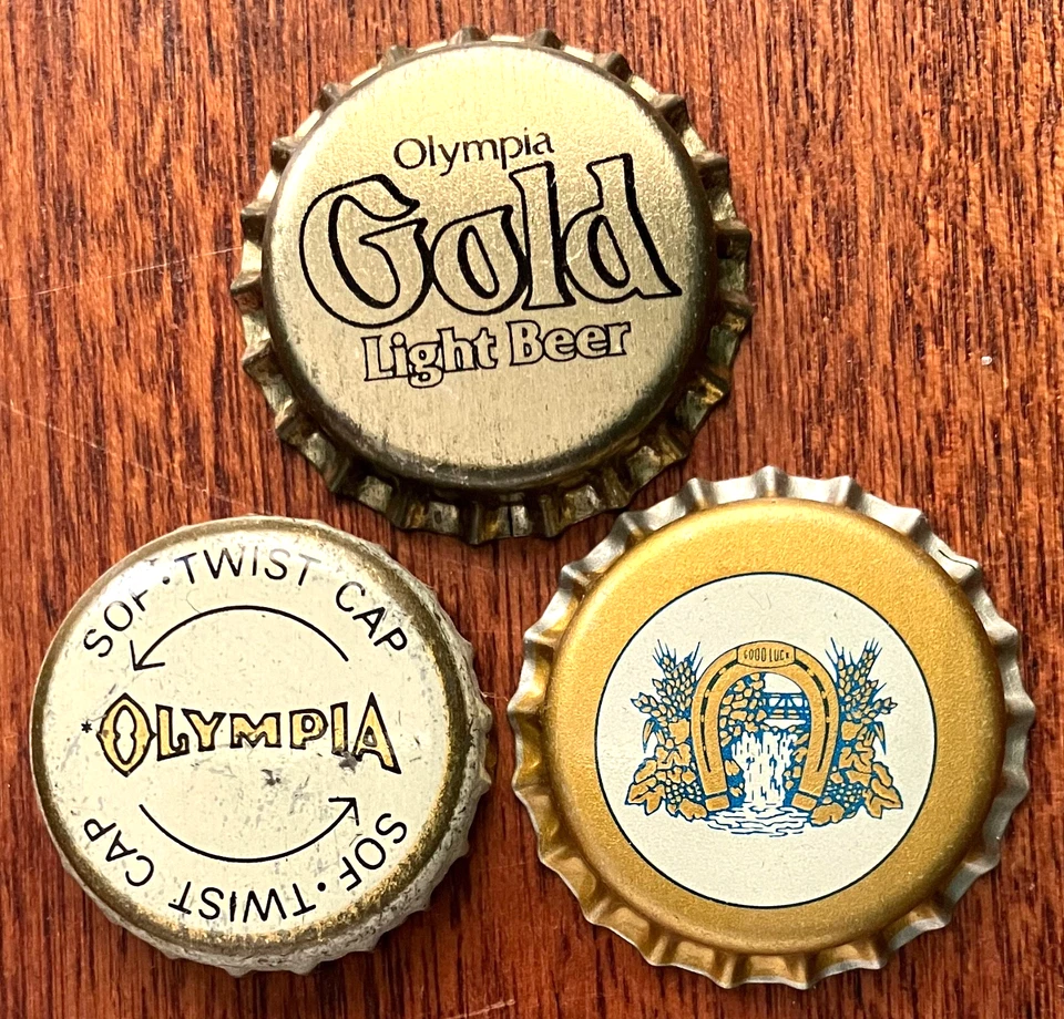 3 OLYMPIA Beer Plastic Lined Bottle Caps, Tumwater WA Brewing