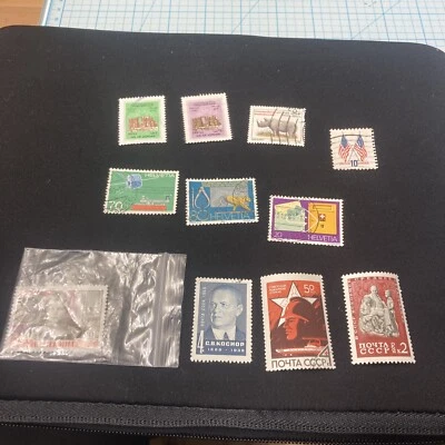 USED Vintage Mixed Lot of 10 World Stamps- USSR/Helvetia etc + 10Cent US Stamp.