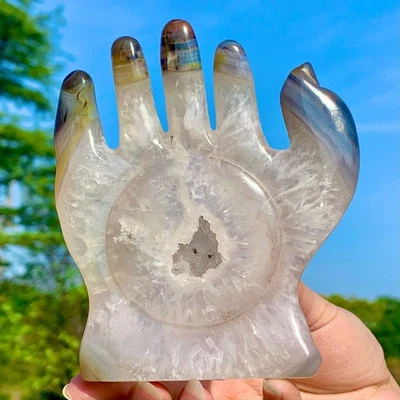283G Natural Grey Agate Crystal Cave Hand-Carved Palm Quartz Gem Healing