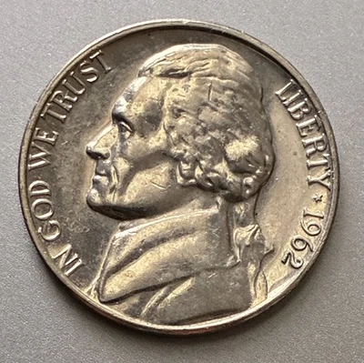 A BEAUTIFUL 1962 JEFFERSON NICKEL. VERY LIGHTLY CIRCULATED.