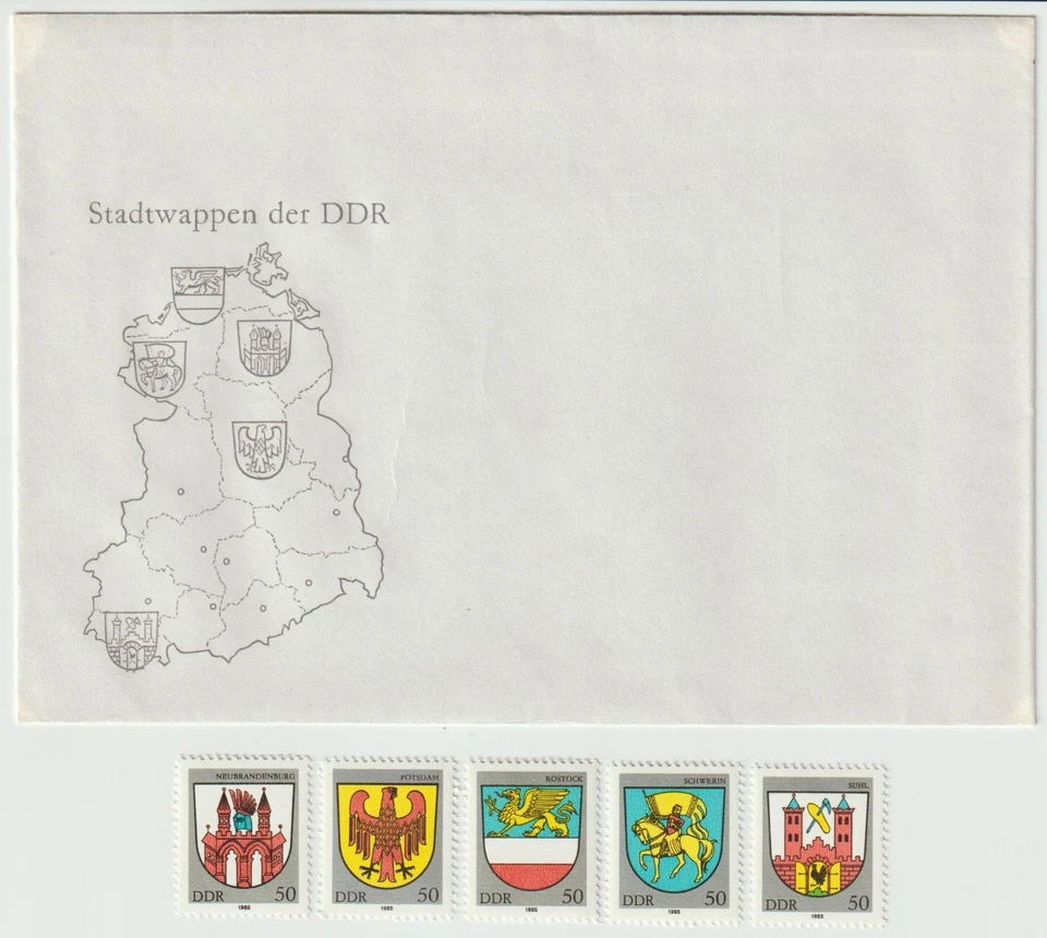 DDR-Briefmarken, FDC und Briefm.: „Stadtwappen (III)“, 1985, Mi.2934-38.#155