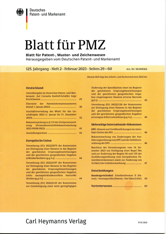 Februar 2023 : Blatt für PMZ. Blatt für Patent-, Muster- und Zeichenwesen.