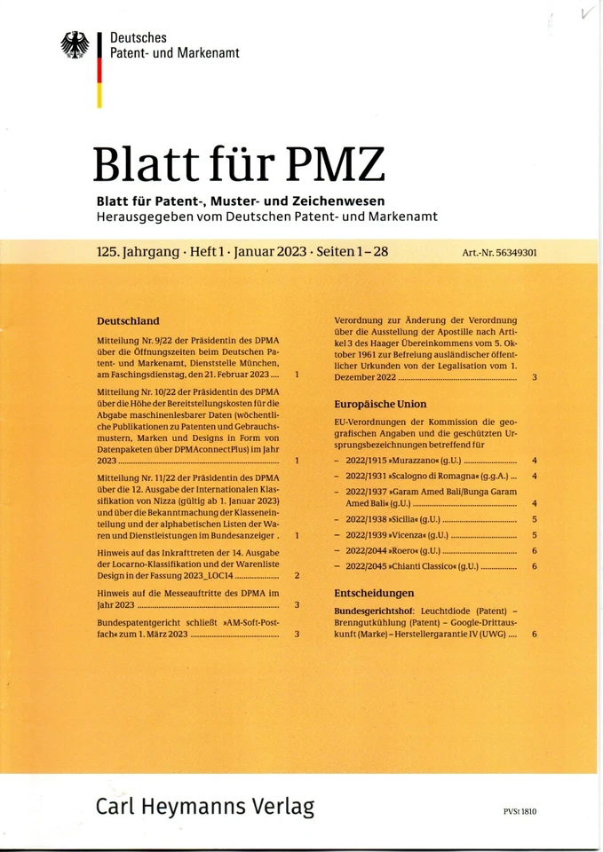 Januar 2023 : Blatt für PMZ. Blatt für Patent-, Muster- und Zeichenwesen.