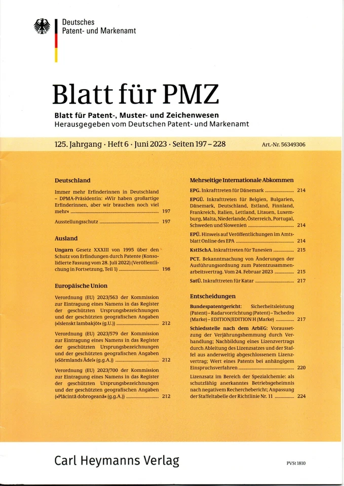 Juni 2023 : Blatt für PMZ. Blatt für Patent-, Muster- und Zeichenwesen.