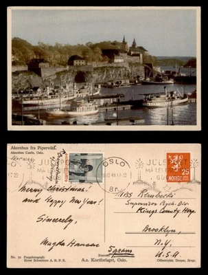 DR WHO 1949 NORWAY CHRISTMAS SEAL TIED AKERSHUS CASTLE PSOTCARD TO USA w29356