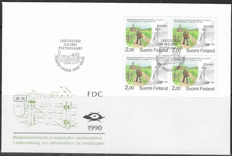 Finland 1990 Postman, Rural Postal Services, BLOCK OF FOUR First Day Cover