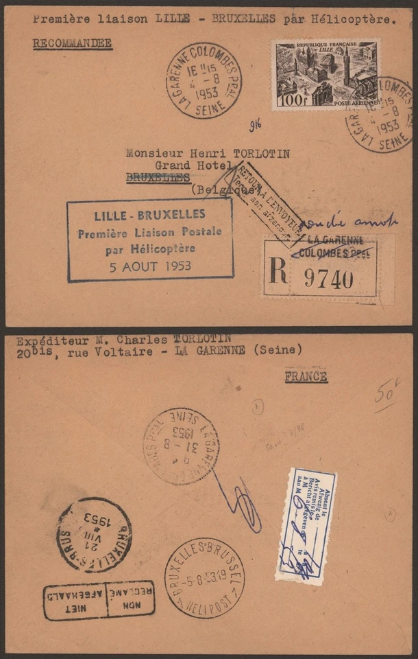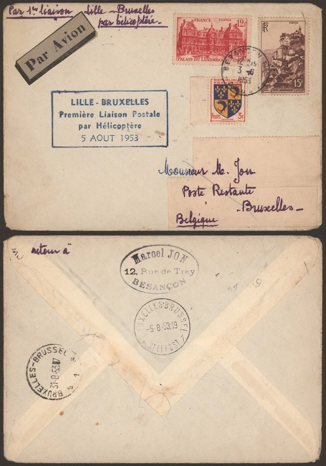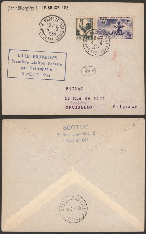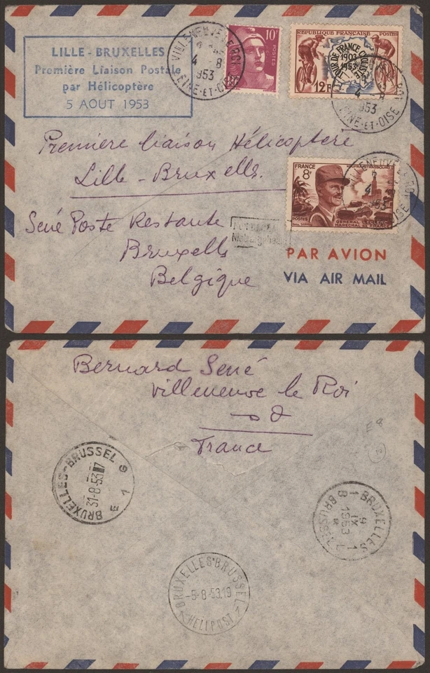 France 1953 - Air Mail Cover Helicopter Flight to Belgium G529