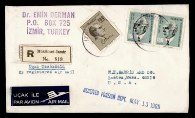 DR WHO 1969 TURKEY REGISTERED HUKUMET IZMIR AIRMIAL TO USA 150K PAIR M65627