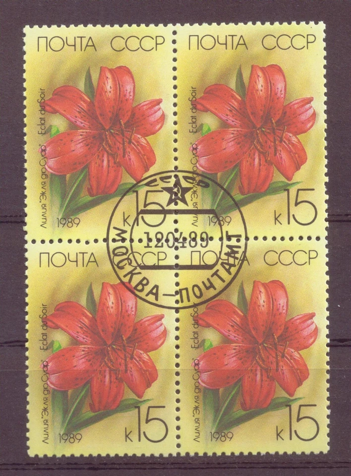 Russia, USSR, Block of 4 with Postmark, Eclat du Soir Lily, MNH CTO, 1989