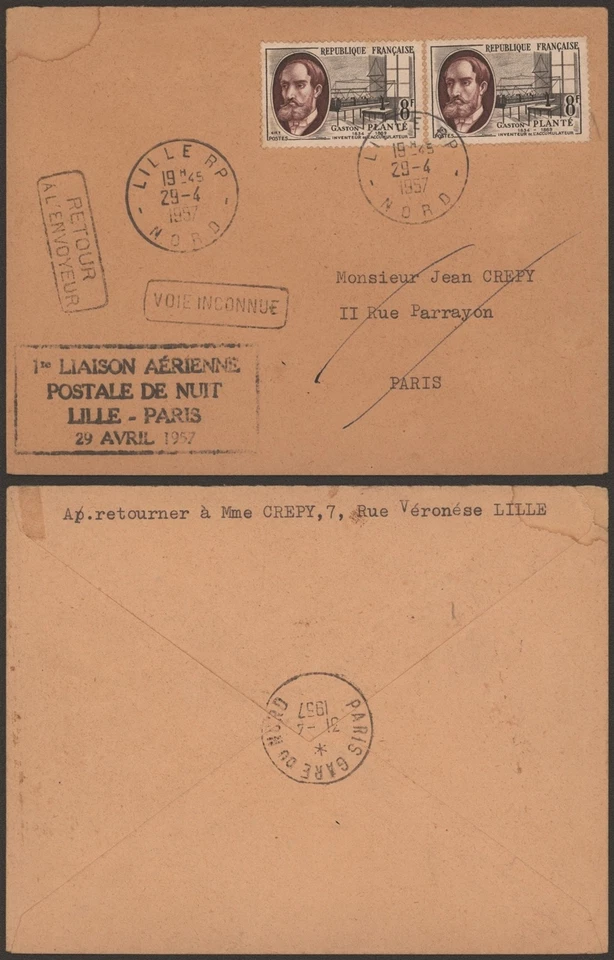 France 1957 - Air Mail Cover Night Flight Lille Paris G519