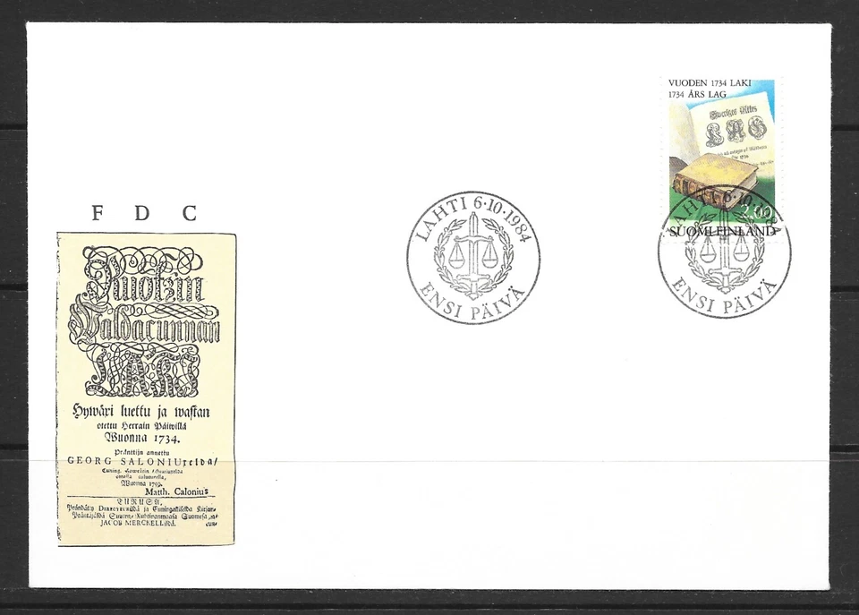 1984 Finland FDC dated 6 Oct 1984 featuring 250th Anniversary of the Law of 1734