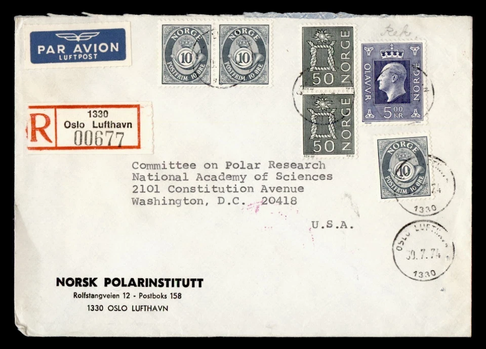 DR WHO 1974 NORWAY PAIR REGISTERED AIRMAIL OSLO TO USA M56824