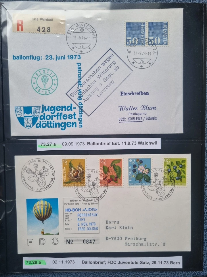 Sale! Switzerland 1973 Balloon Mail 2 covers PRO PATRIA