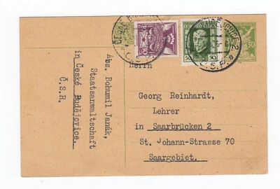 CSR postcard postal stationery additional franking České Budějovice 2 to Saarbrücken 1925