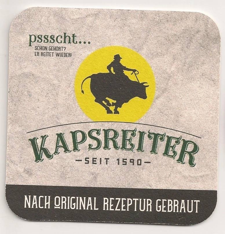 Kapsreiter Bier, Schärding - Bierdeckel "Er reitet wieder" aus Oberösterreich